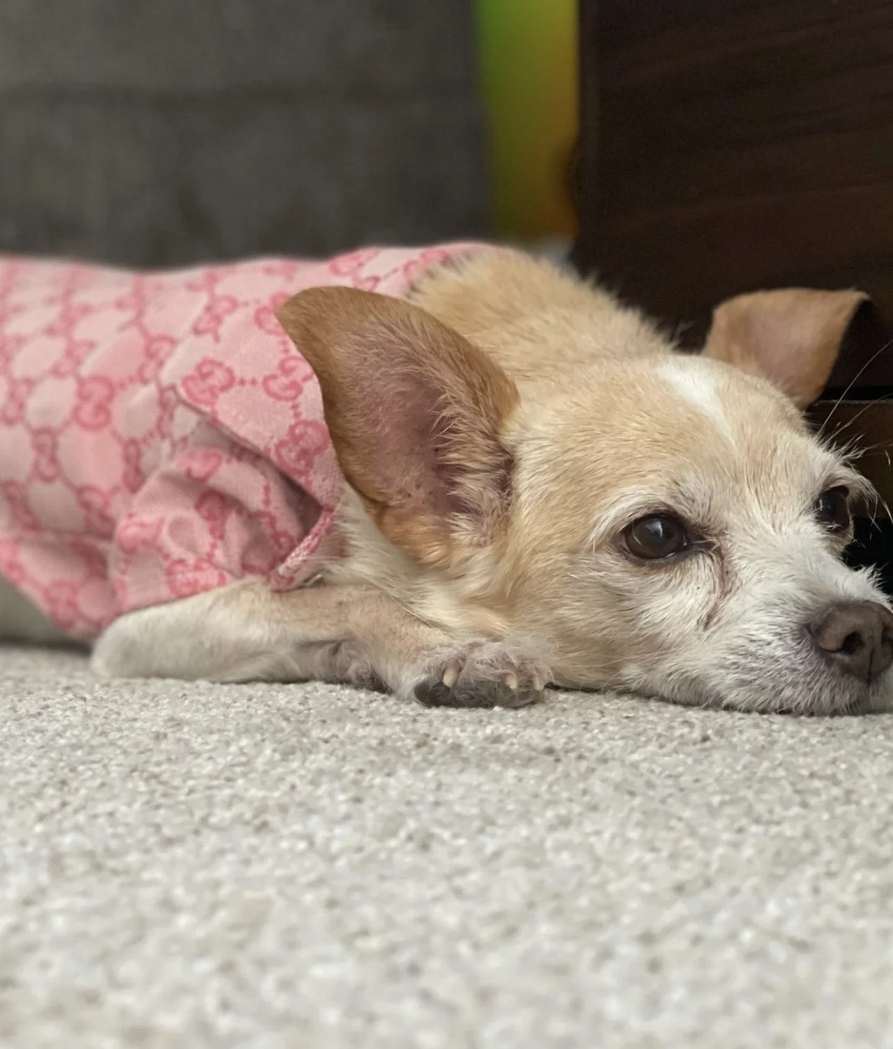 Small tan and white dog lying on a carpeted floor wearing a pink patterned garment, resting its head on the floor with a relaxed expression.